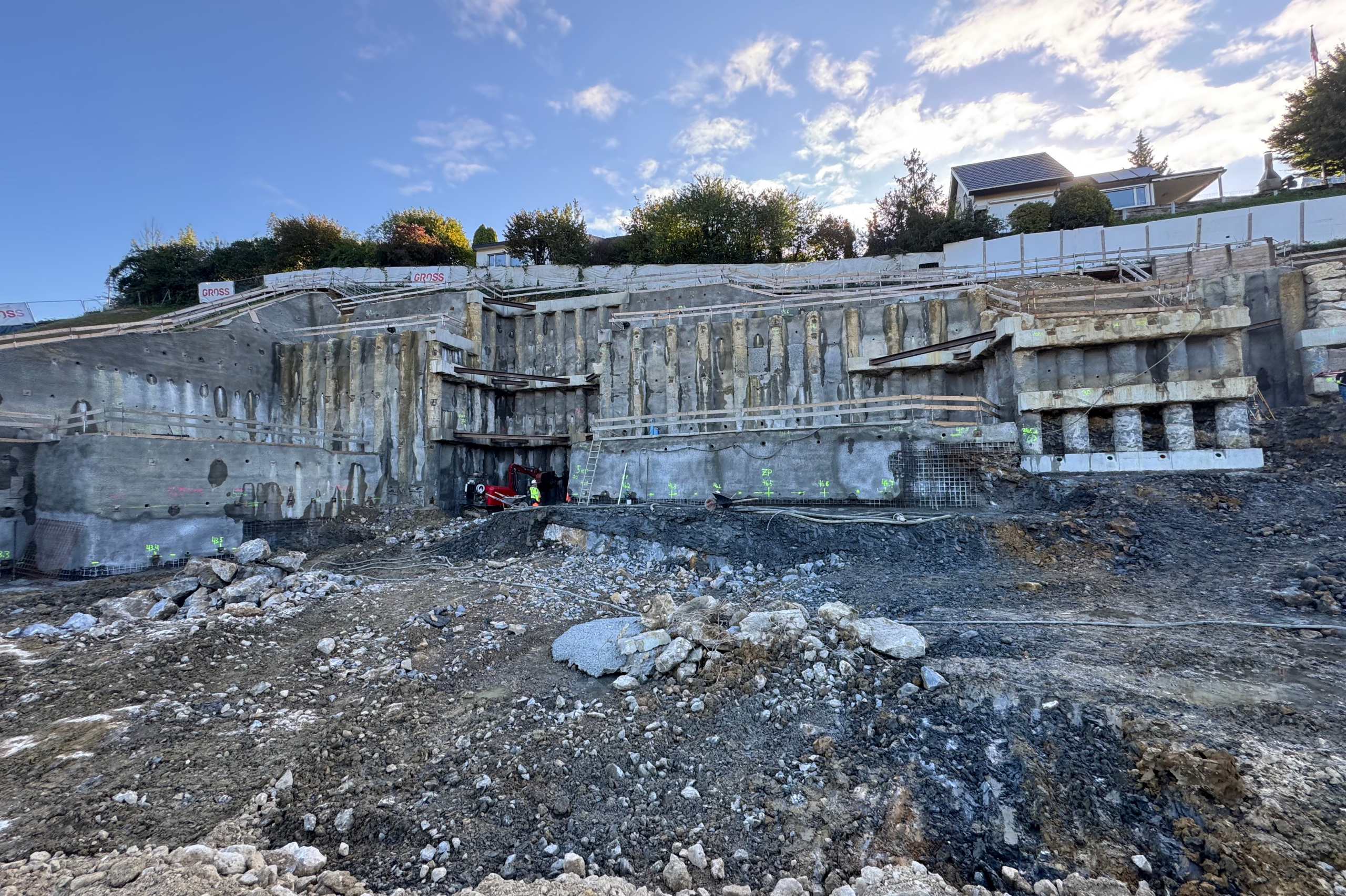 Durch die steile Topografie und den begrenzten Platz wird die Baugrubensicherung abschnittsweise von oben nach unten ausgeführt. Zum Einsatz kommen dabei verschiedene Sicherungselemente wie Bohrpfähle, Nagelwände, Kopfriegel und Betonlongarienen, die zusammen eine stabile Grundlage für die weiteren Bauphasen schaffen.